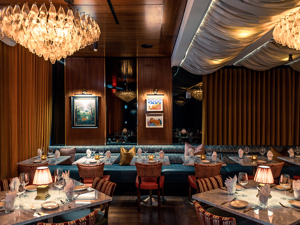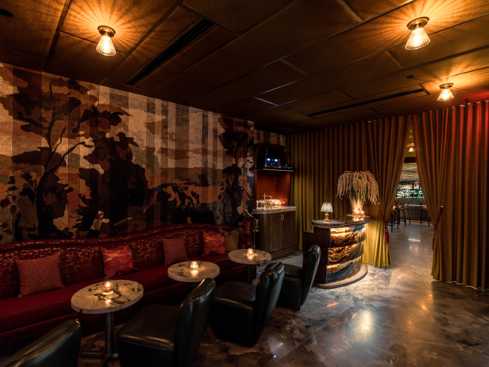 Designed by Fettle, Sirrah’s 120-seat space embraces a bold maximalist aesthetic, rich in layered textures, saturated tones, and eclectic detail. Each room is intentionally distinct, offering its own mood, palette, and pace. The design unfolds with a sense of theatrical progression, creating moments of surprise and discovery as guests move throughout the space. The experience begins with a patterned entryway wrapped in fabric, velvet curtains, and deep-toned wallpaper in greens, reds, and charcoal, leading to a ten-seat entry bar with a backlit, hand-painted bar front.