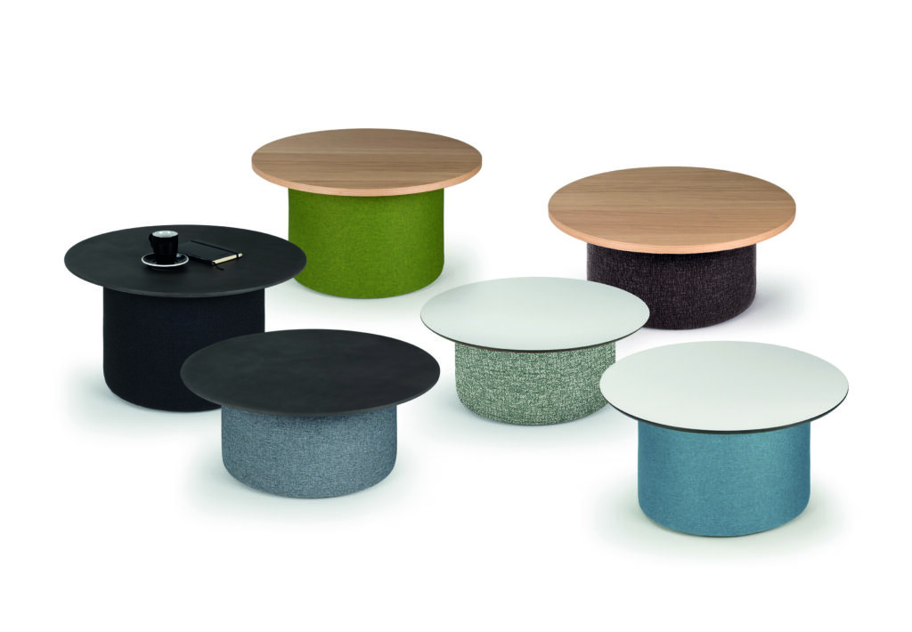 Fulcro is a sound-absorbing coffee table consisting of a wooden base structure upholstered with sound-absorbing technopolymer, with external upholstery covering in Snowsound-Fiber Textiles 3 Melange or 8 Bouclé fabric. The table top is available in cement, white HPL, or light oak wood.
