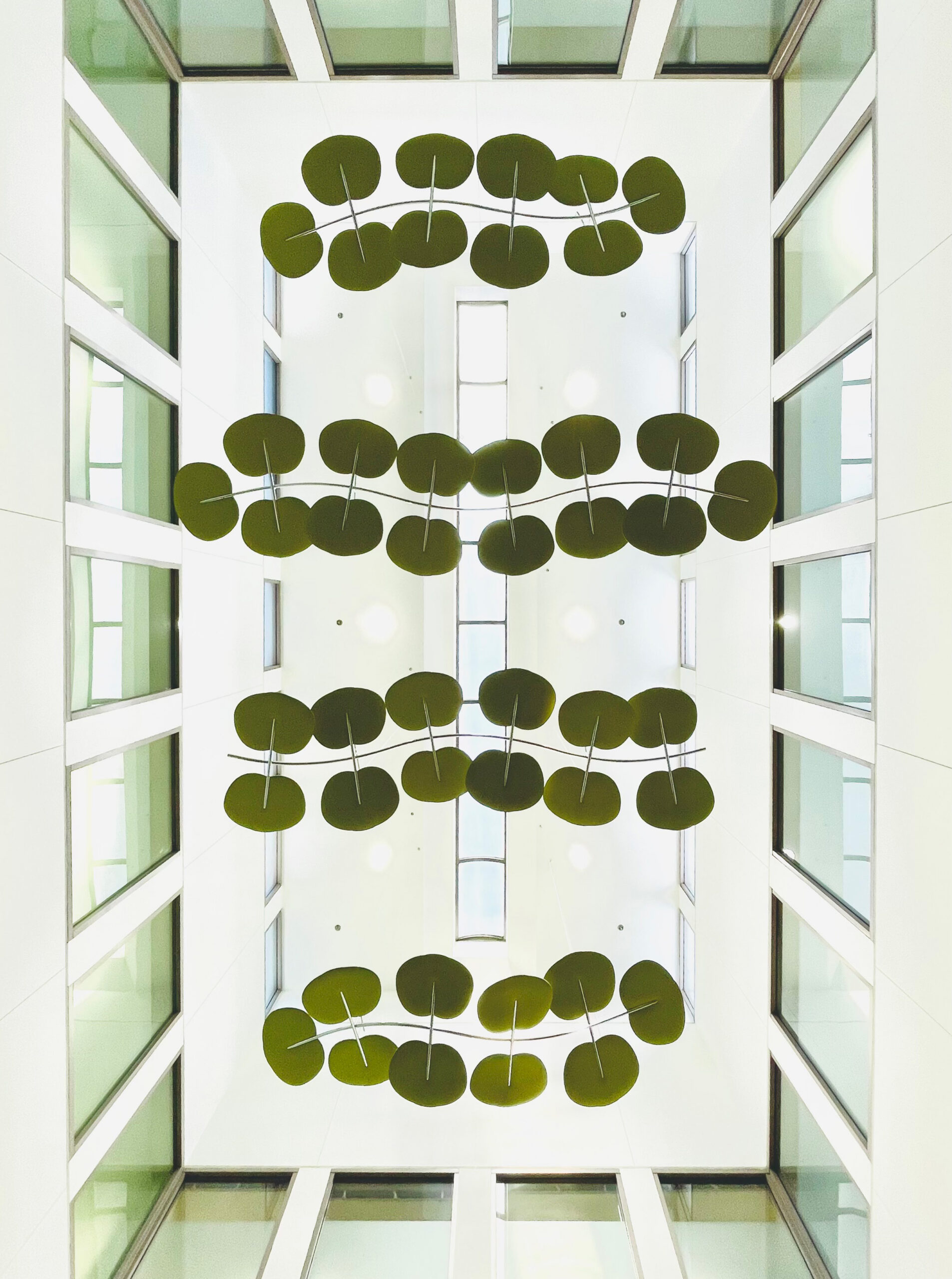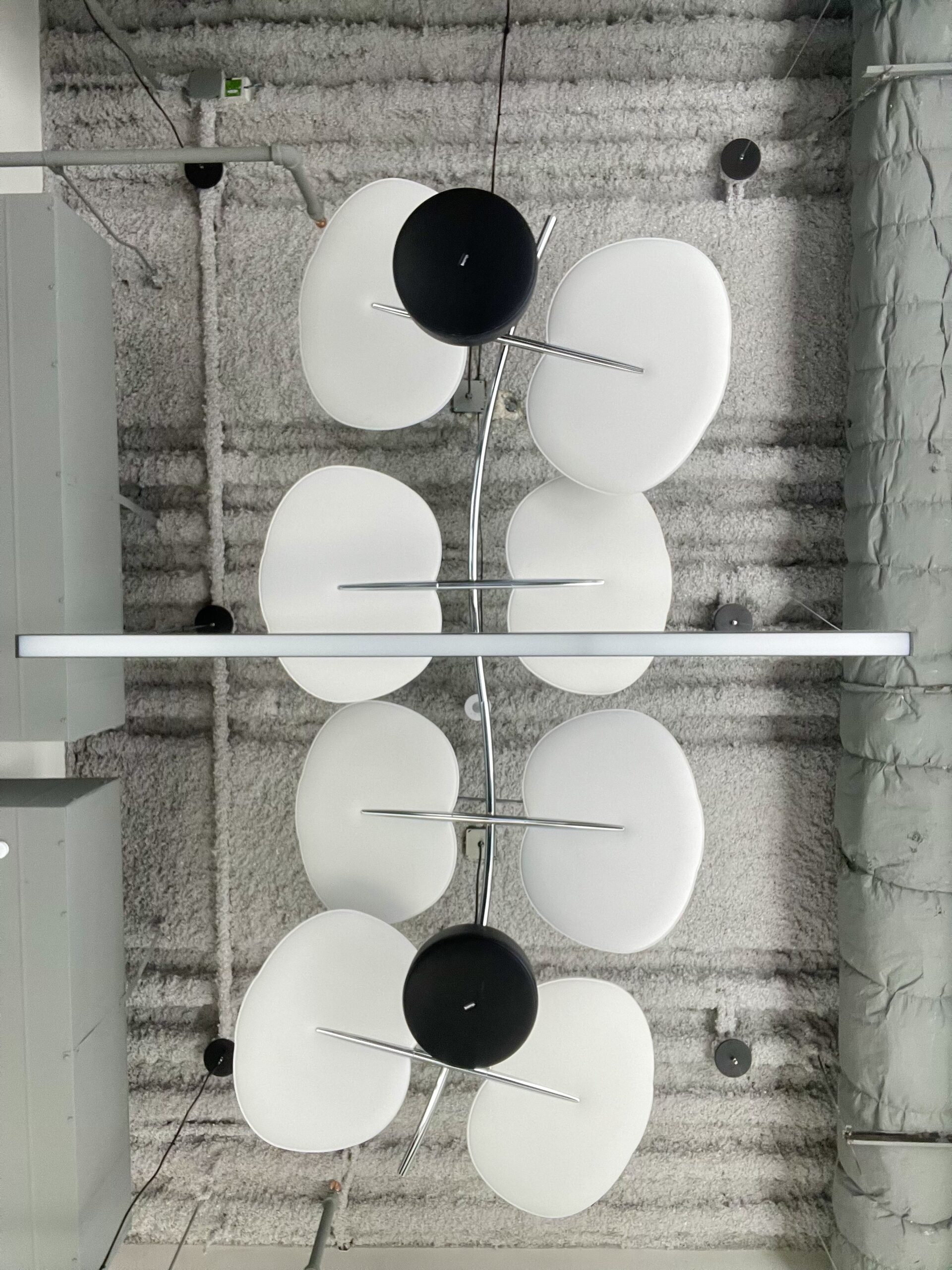 The Botanica sound-absorbing system comprises leaf-shaped panels supported by chromed metal fixtures that can be adjusted at various angles and combined with different support structures.The modular frame allows for both wall installation and ceiling mounting, constructed from chrome-plated tubular steel, featuring a distinctive 3D curvature of the tube. In the ceiling-mounted version, the frame comes equipped with adjustable cables for anchoring